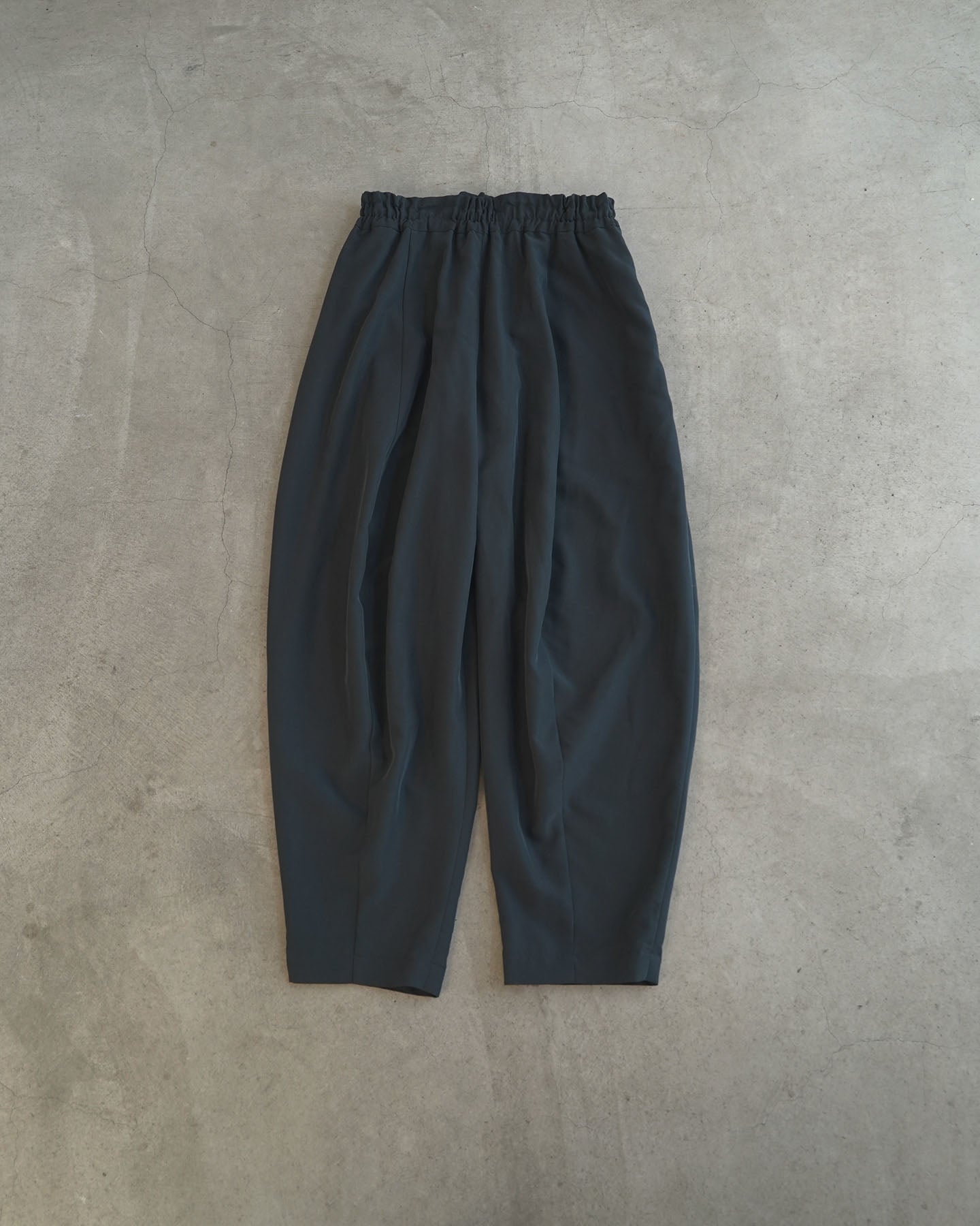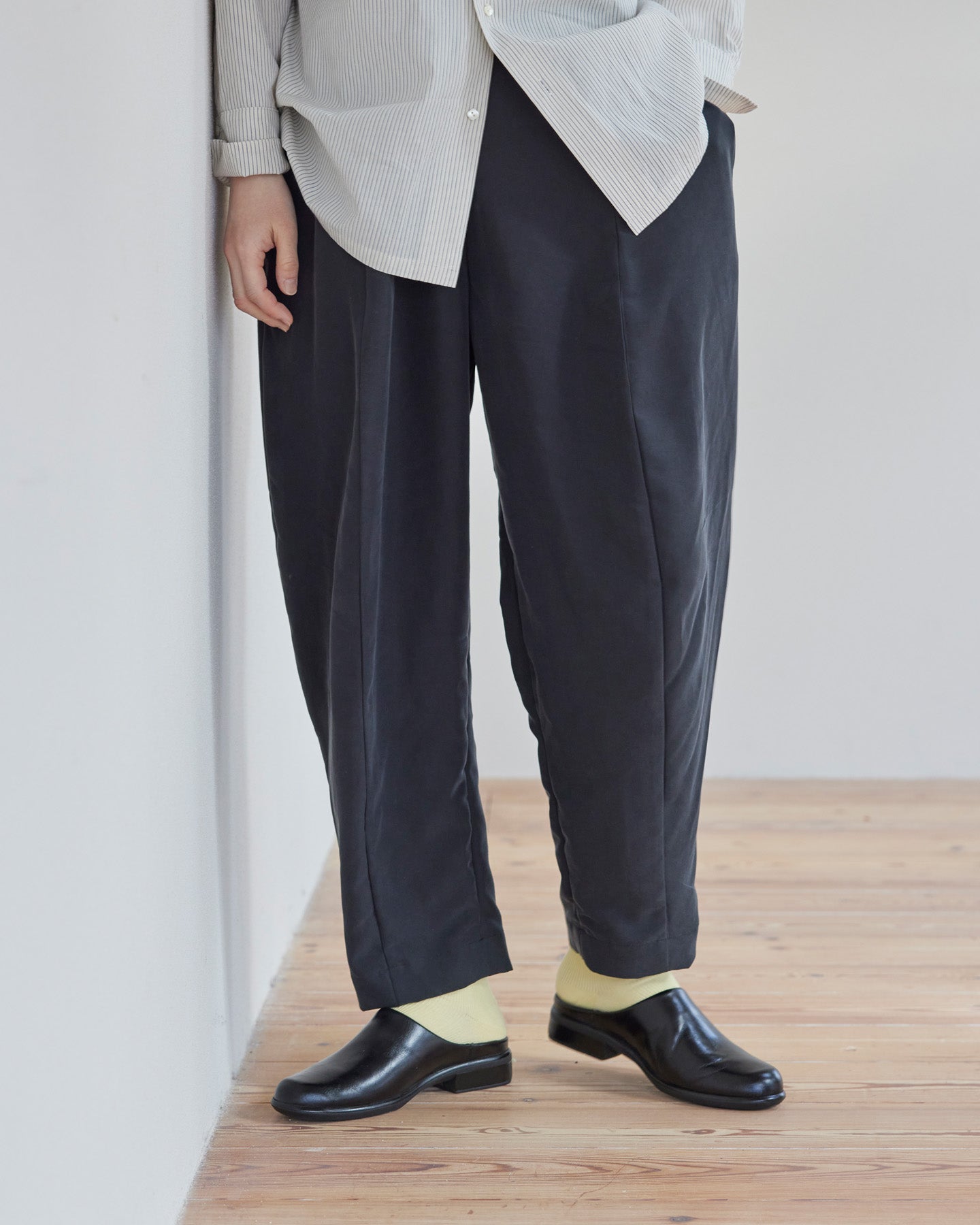 裾に向かって細くなっていくシルエットですっきりとした印象ながら、股上は深く取りゆったりと。日常の動きを妨げない穿き心地です。