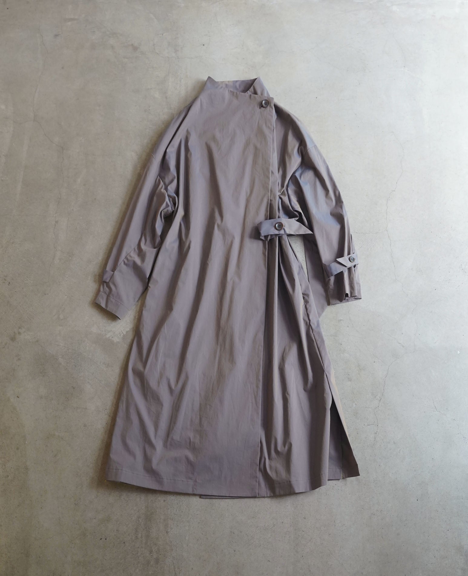 ベルトを留めるとアシンメトリーなデザインがひとくせ効いた、やさしいAラインシルエット。首元はボタンを留めて立ち襟に、折り曲げると大きな襟に様変わり。