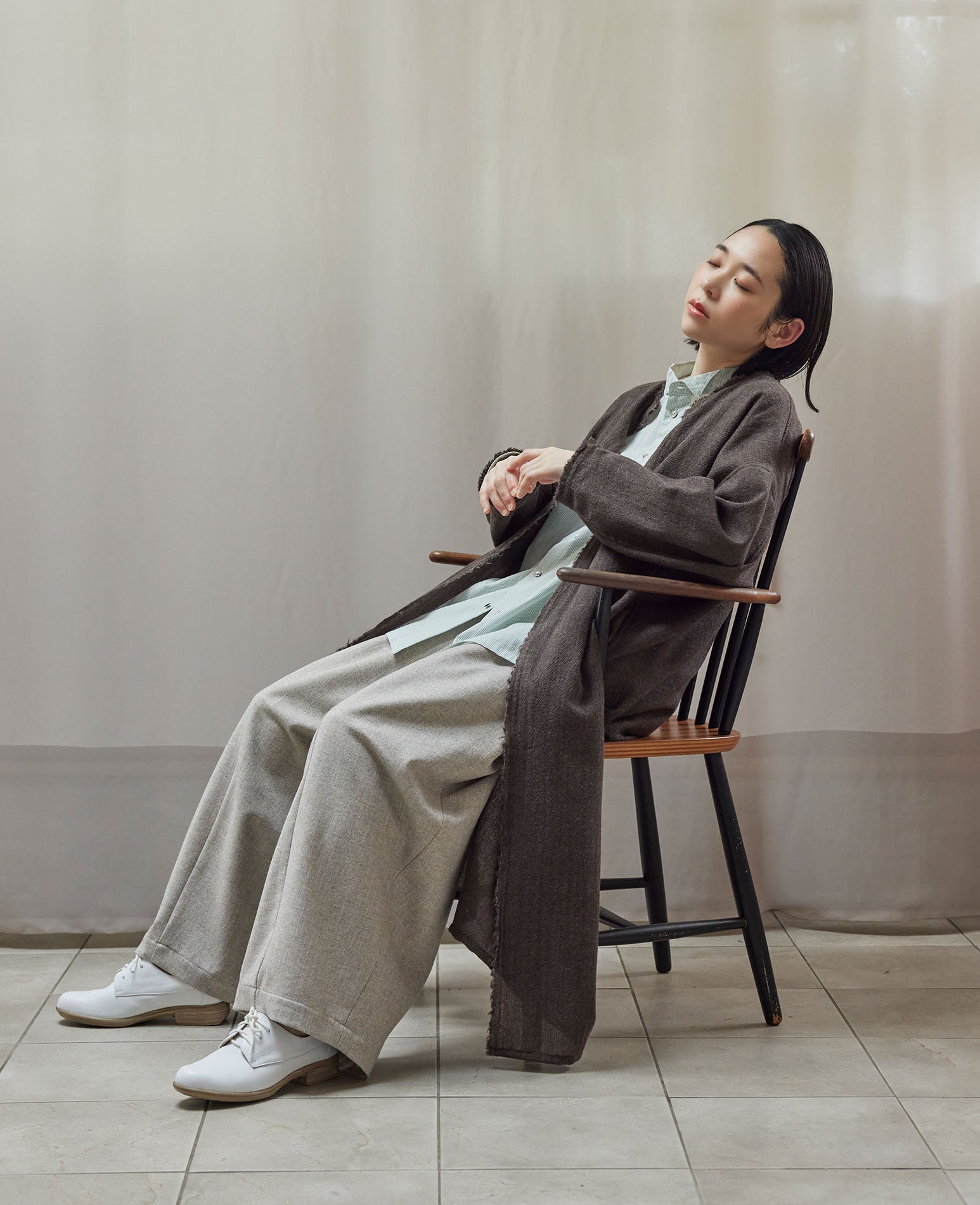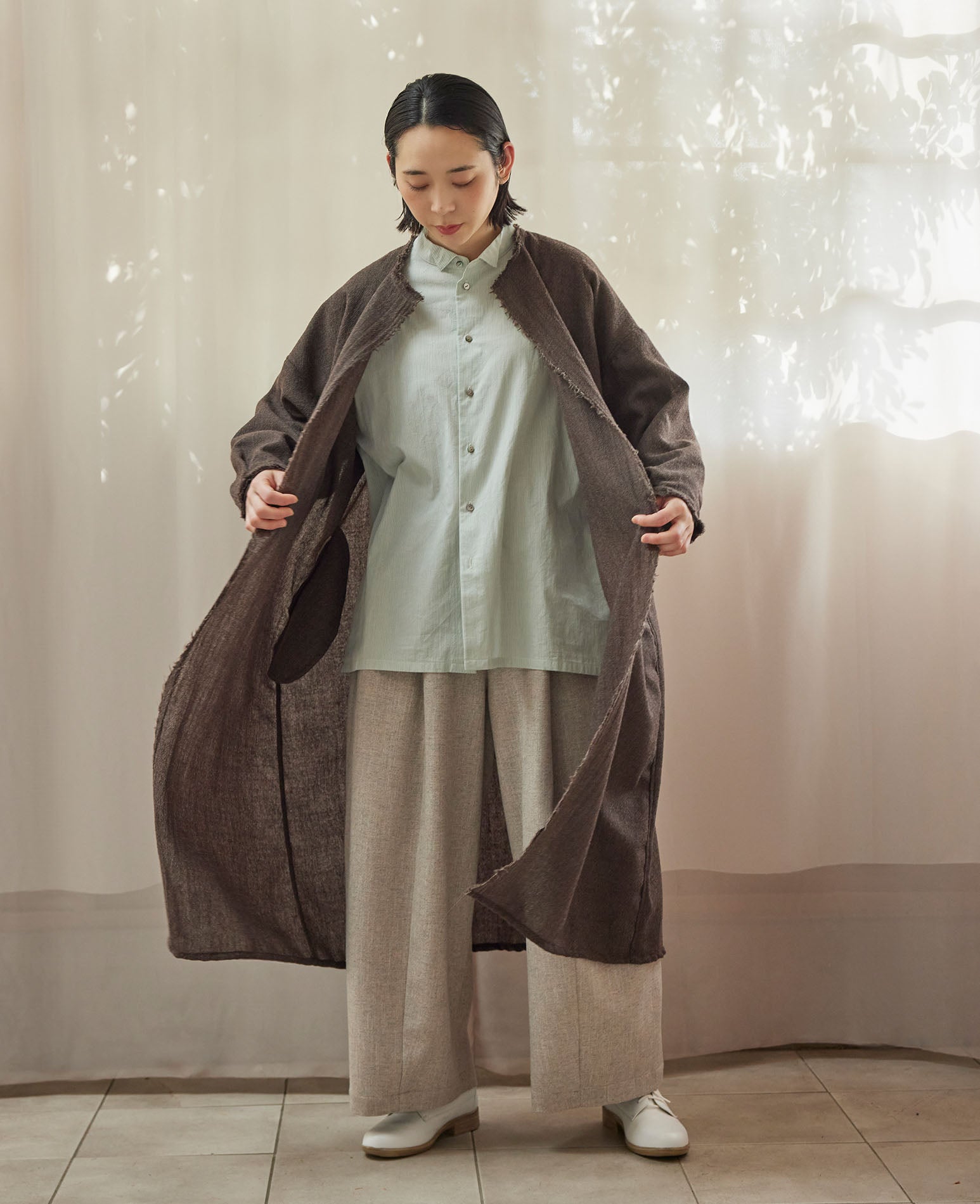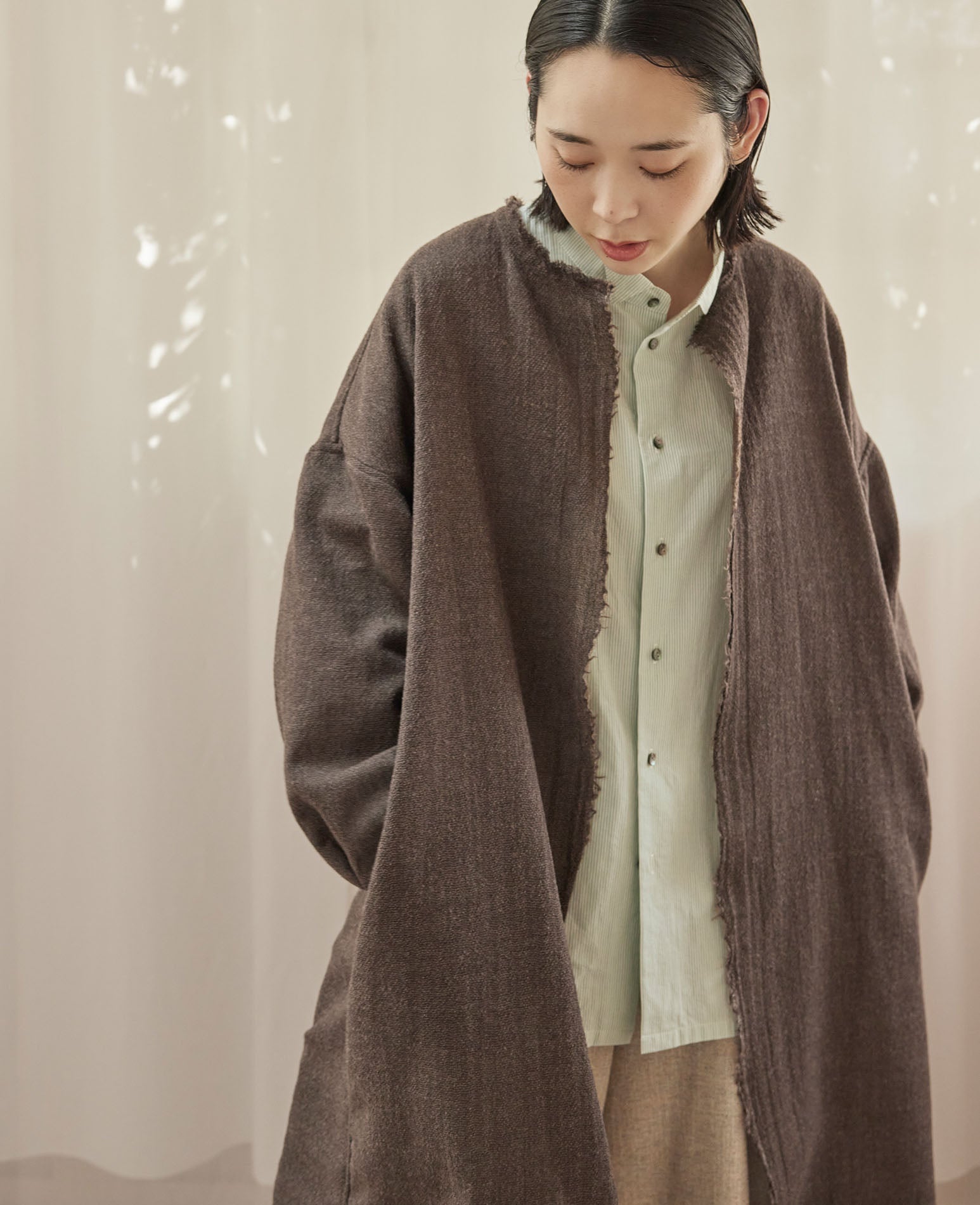 身幅や肩周りにゆとりを持たせた、身体のラインを拾わない落ち感のあるシルエットで、羽織ることで縦のラインが加わり、すっきりとした佇まいに。