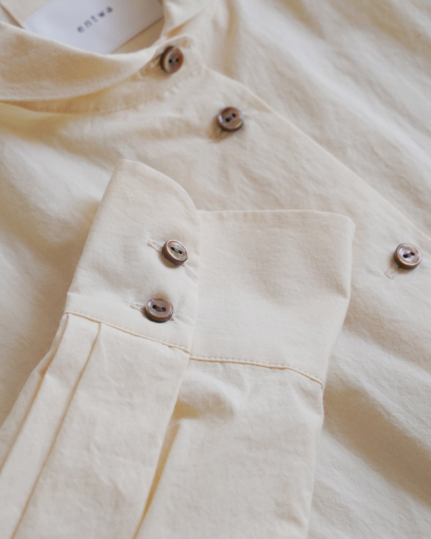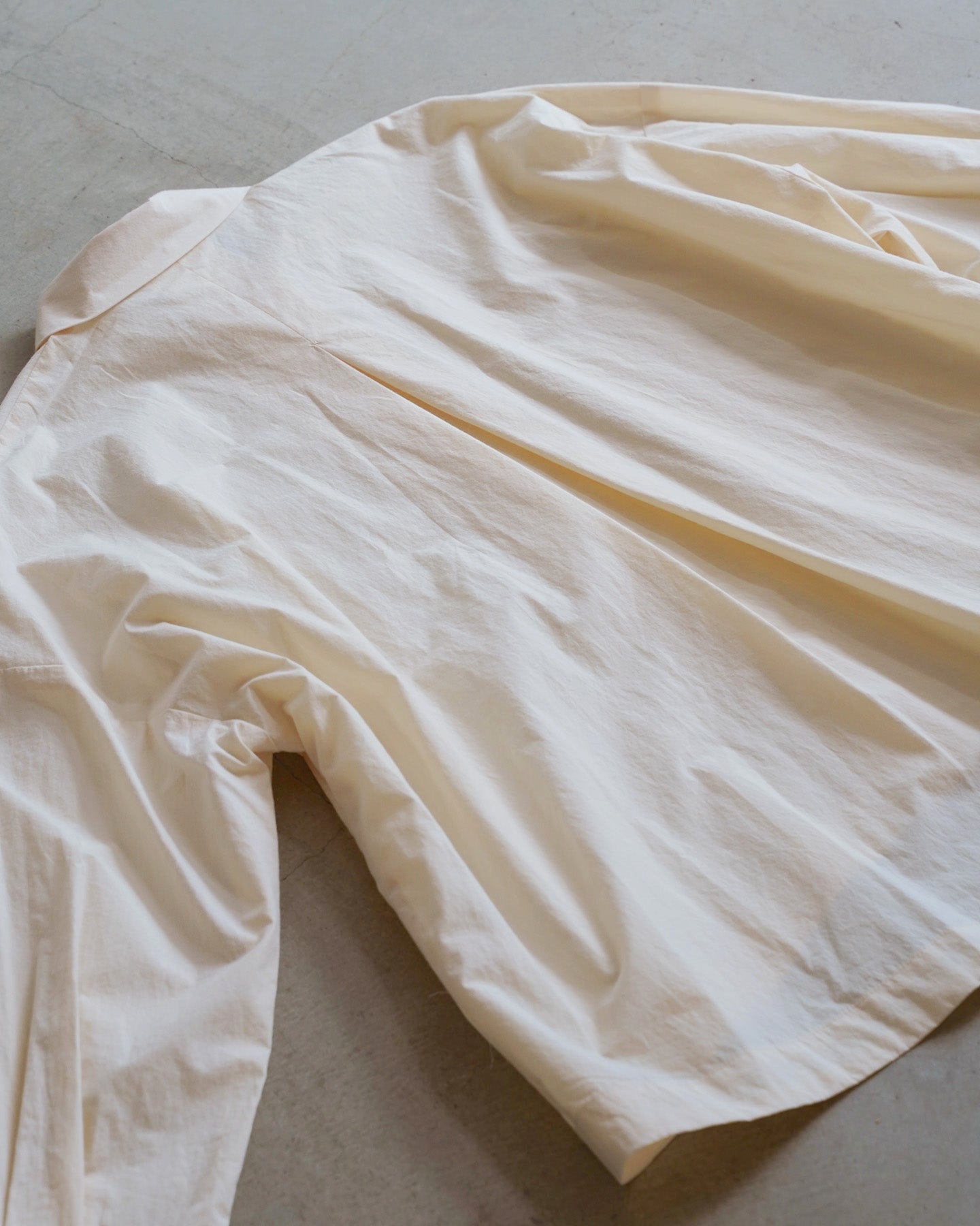 カフスから伸びるタックが袖に柔らかな立体感をだし、動きのあるシルエットに。