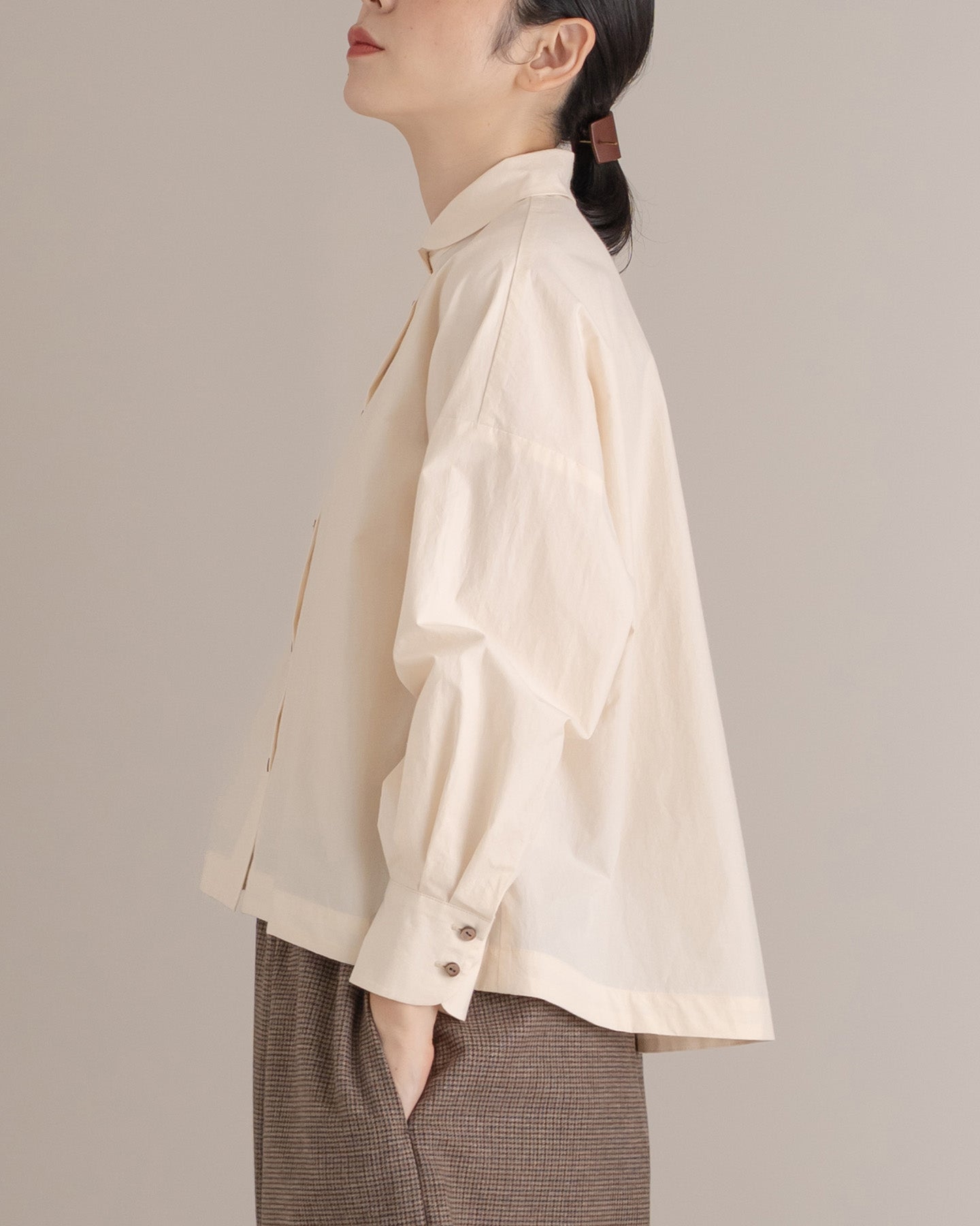 襟や袖が愛らしい雰囲気ですが、ボックスシルエットにすることでほんのりモード感もある、程よいバランスです。