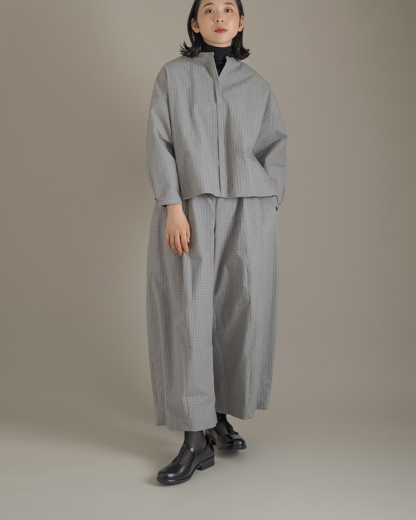 同素材のスタンドカラーシャツとのセットアップもおすすめ。
