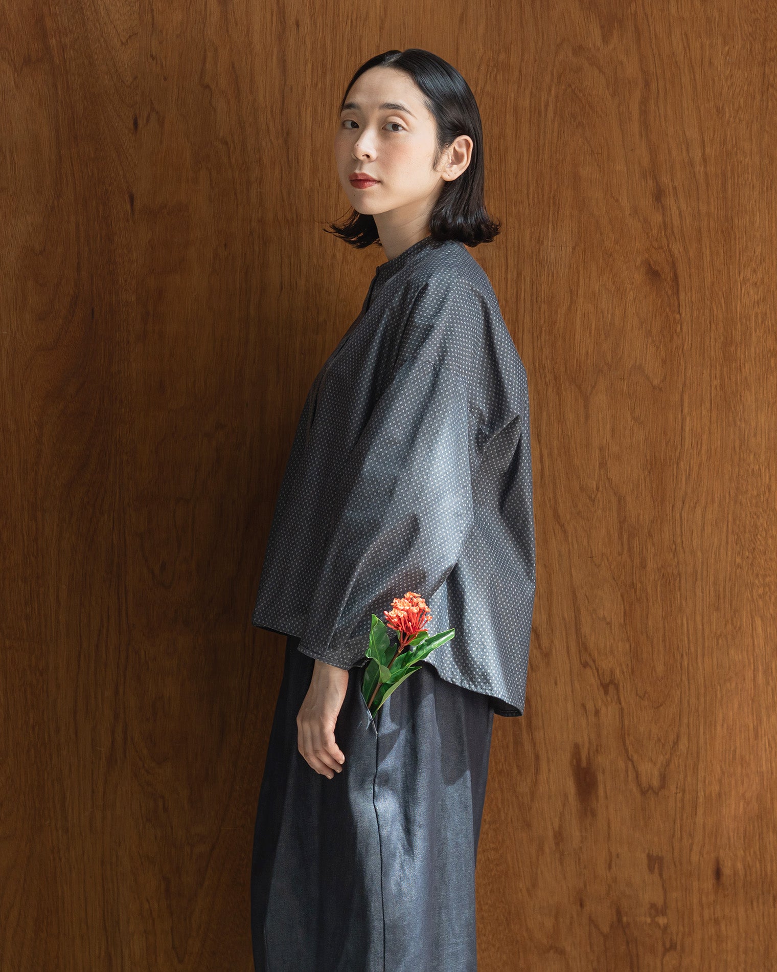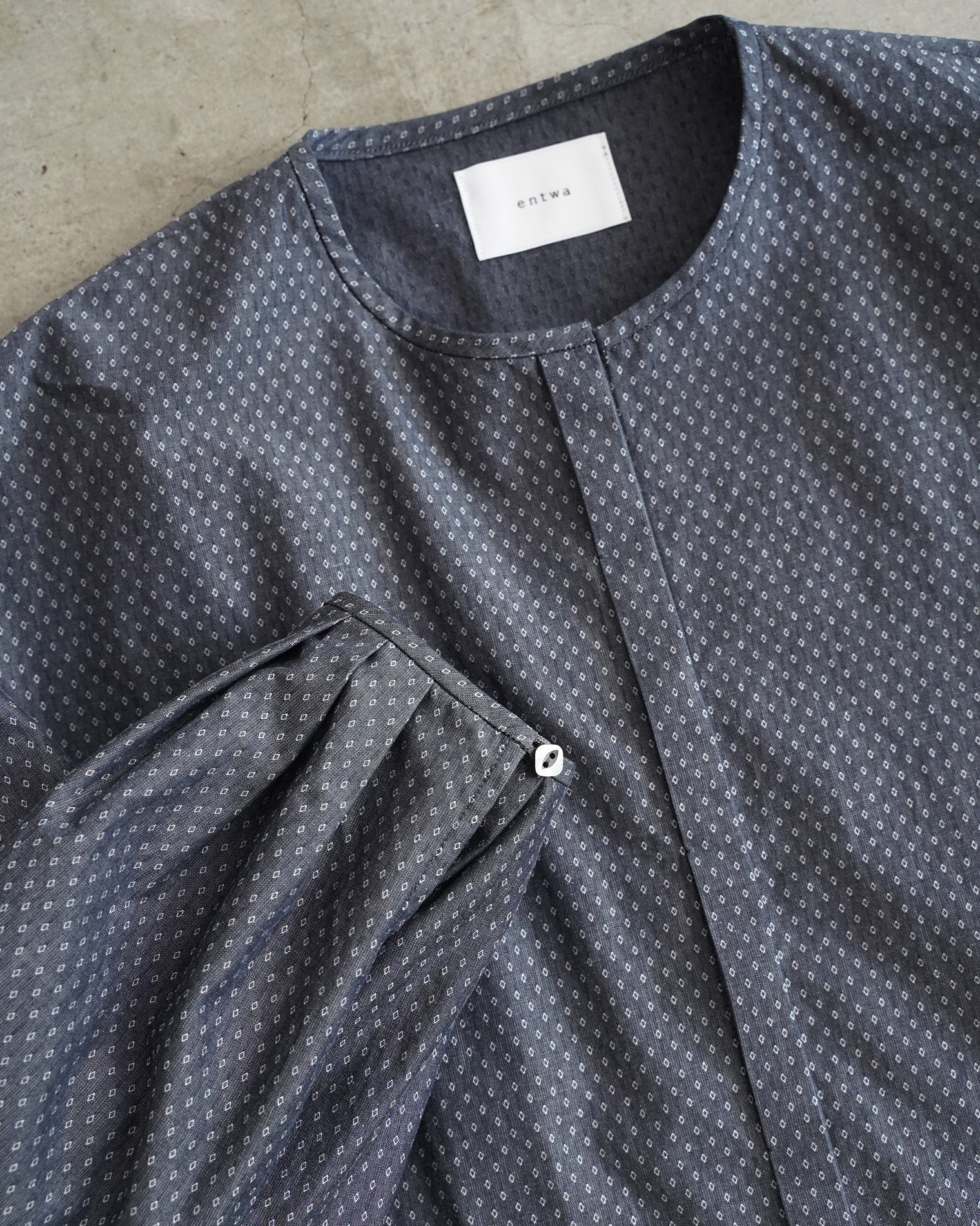 ・すっきりとしたバンドカラーと立体的な袖タックが上品な印象に